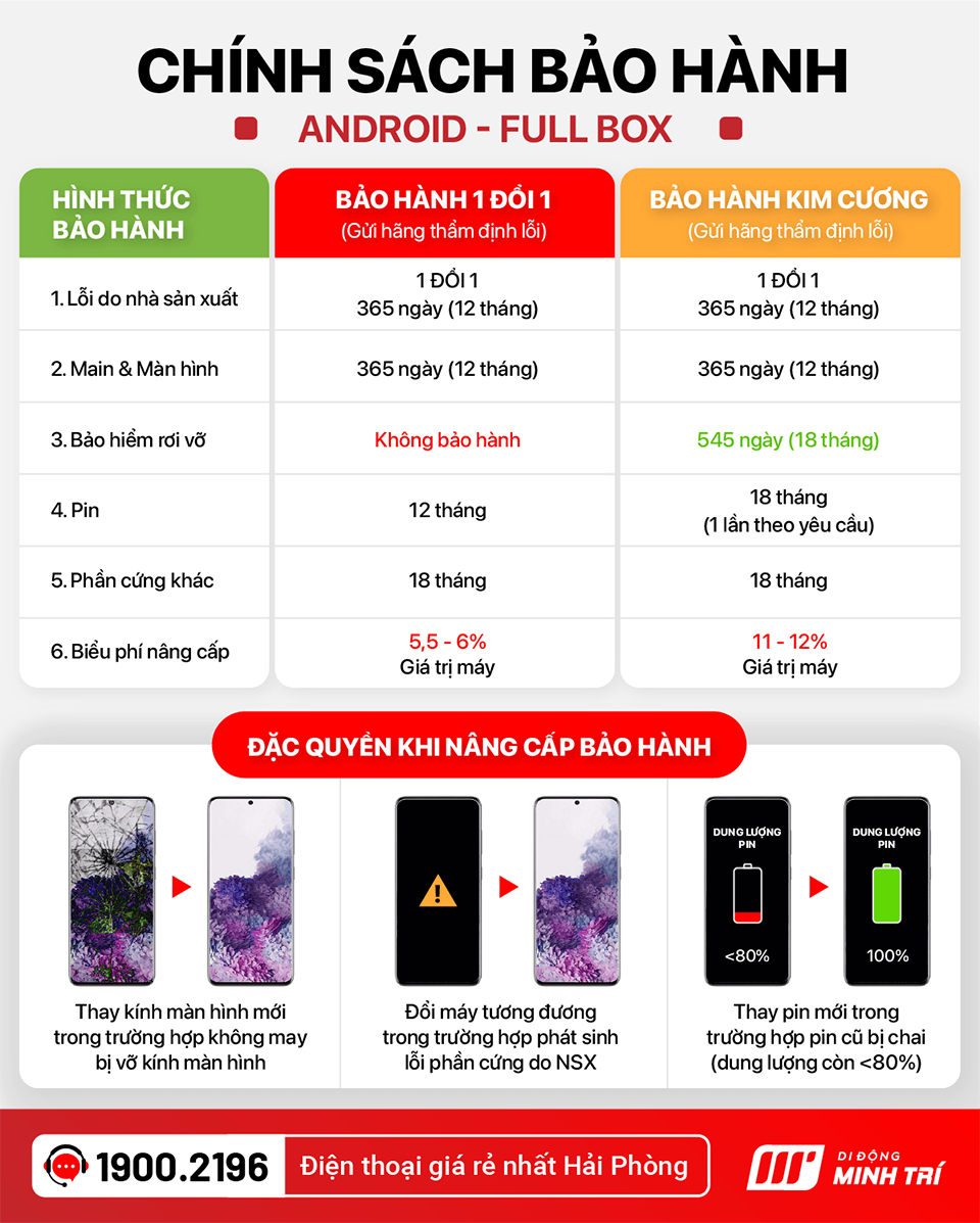 Hiểu được mong muốn của khách hàng là luôn tìm kiếm những sản phẩm chất lượng cùng chế độ bảo hành tốt. Vì lí do đó mà mọi sản phẩm do Minh Trí Mobile. bán ra đều đi kèm với 1 chế độ bảo hành toàn diện nhằm mang đến sự an tâm cho khách hàng khi mua sắm tại hệ thống của chúng tôi.