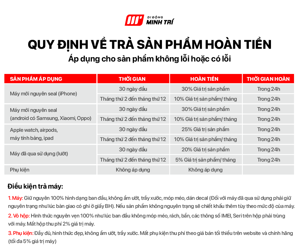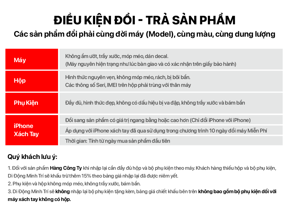 - Minh Trí Mobile chỉ áp dụng đổi sản phẩm TƯƠNG TỰ tại thời điểm đổi. Nếu khách hàng đổi sản phẩm khác cửa hàng xin phép trừ chiết khấu theo giá máy hiện tại.