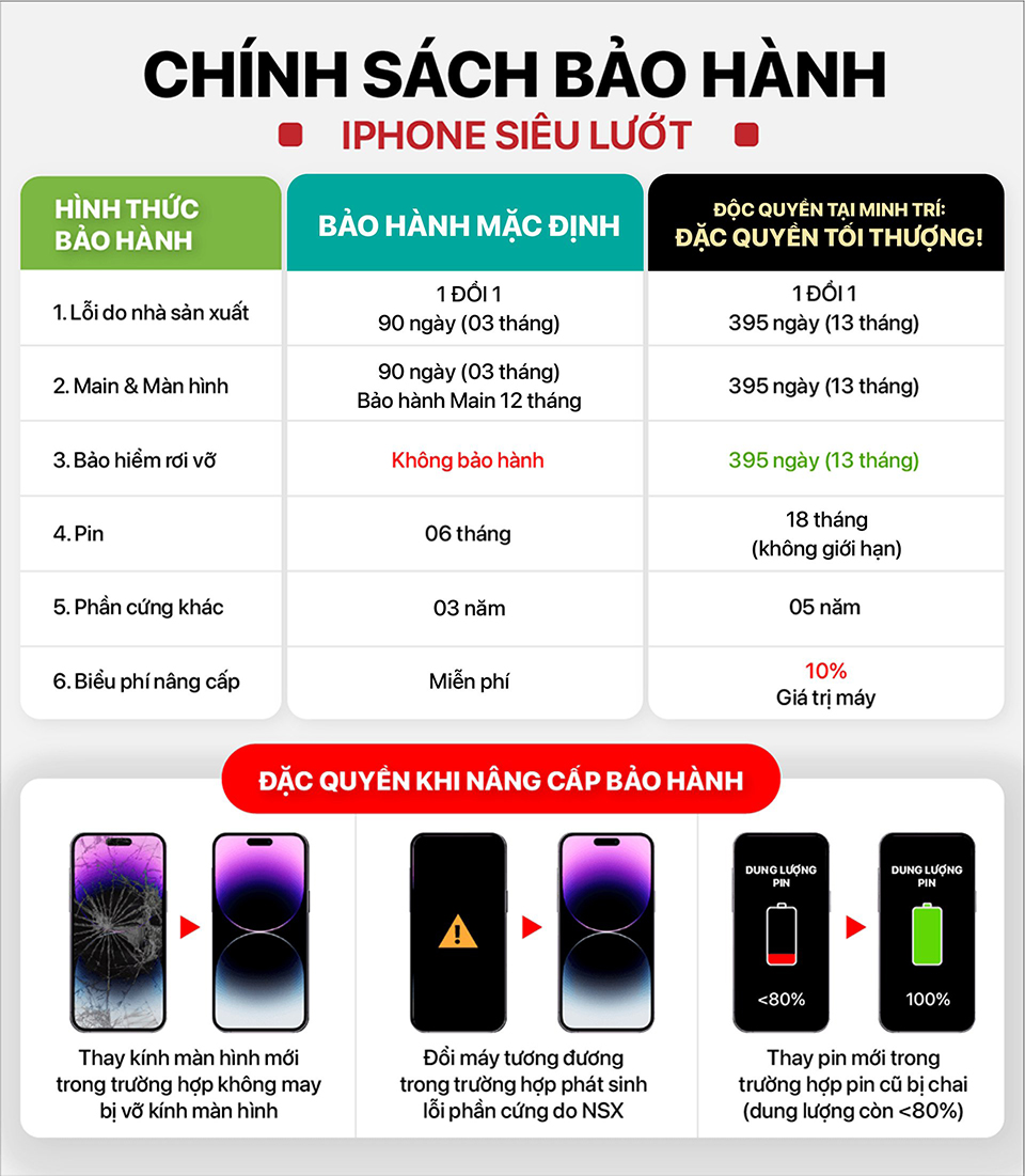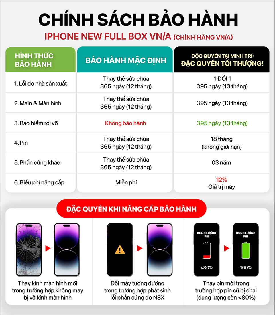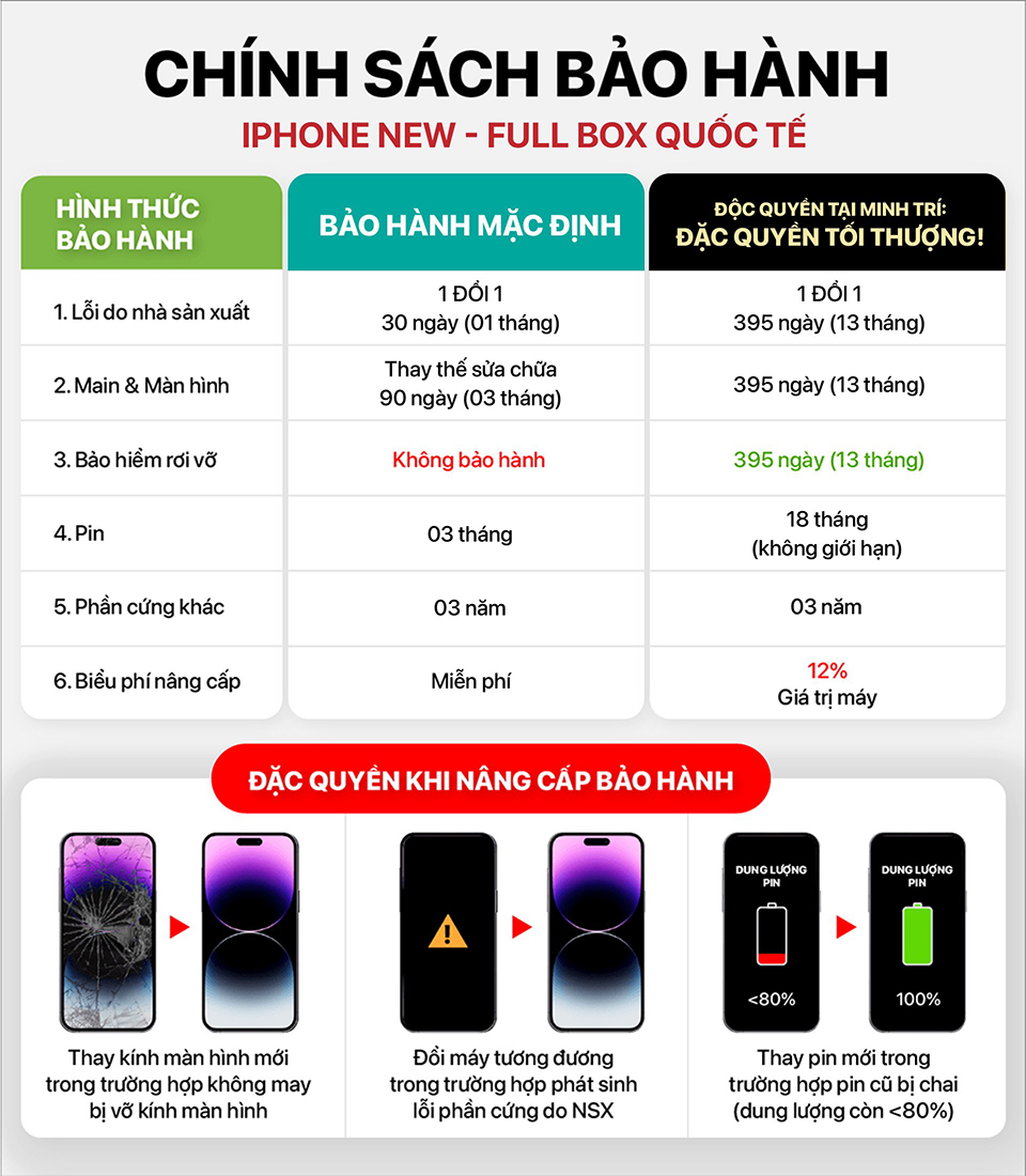 Lưu ý: Đối với trường hợp bảo hành rơi vỡ mặt kính, Di Động Minh Trí sẽ hỗ trợ thay thế miễn phí mặt kính cho quý khách trong trường hợp rơi vỡ lần đầu, những lỗi linh kiện phát sinh (nếu có) bao gồm tất cả thân máy: nguồn, màn hình, camera, chân sạc, mic, cảm ứng... Minh Trí Mobile sẽ hỗ trợ sửa chữa thay thế với giá thành hợp lý nhất cho khách hàng. Quý khách lưu ý sau khi bảo hành thay thế mặt kính, iPhone quý khách sẽ hết bảo hành tại Minh Trí Mobile. Chúng tôi sẽ hỗ trợ khách hàng về giá cũng như ưu đãi về bảo hành linh kiện nếu quý khách thay thế và sửa chữa.