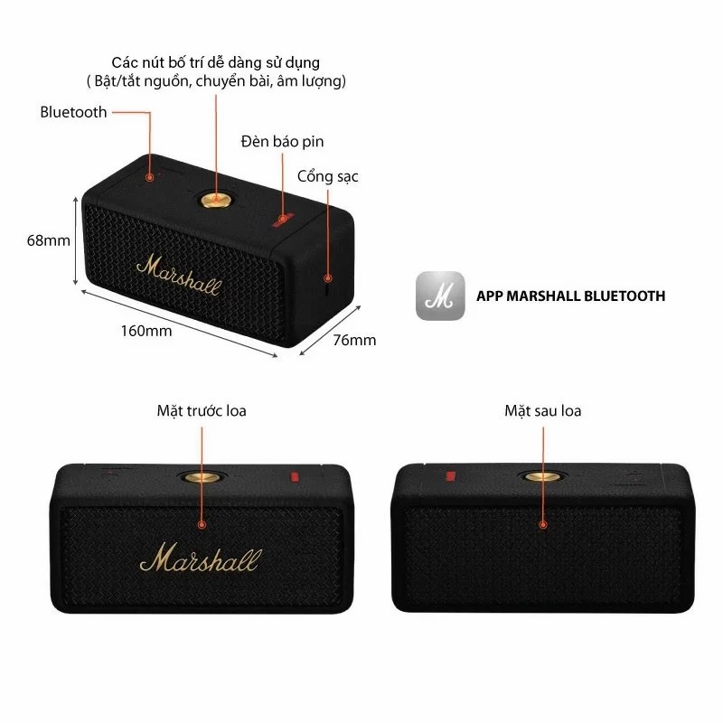 Mặt trước loa là hệ thống ê – căng dạng lưới đan tinh tế, logo “Marshall” màu vàng gắn chính giữa giúp chiếc loa tuy nhỏ nhưng lại có một tổng thể vô cùng dễ chịu. Phía trên là bảng điều khiển với nút điều khiển đa hướng cùng hệ thống đèn led chỉ báo pin cao cấp.