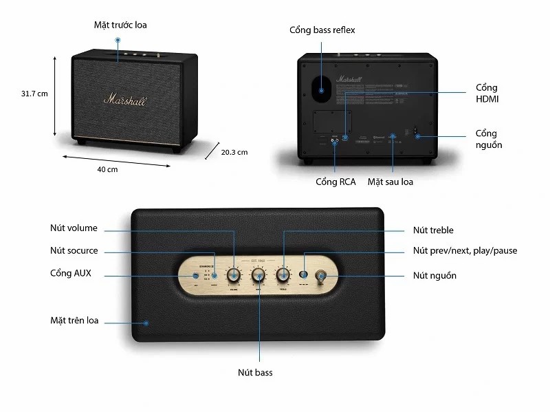 - Kết nối có dây: Đầu vào AUX 3,5 mm, RCA, HDMI
