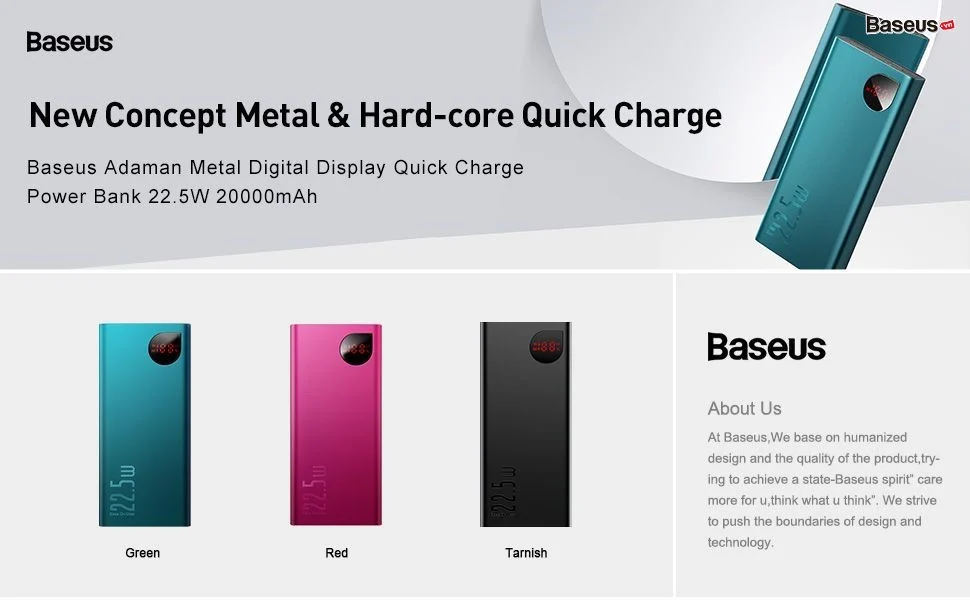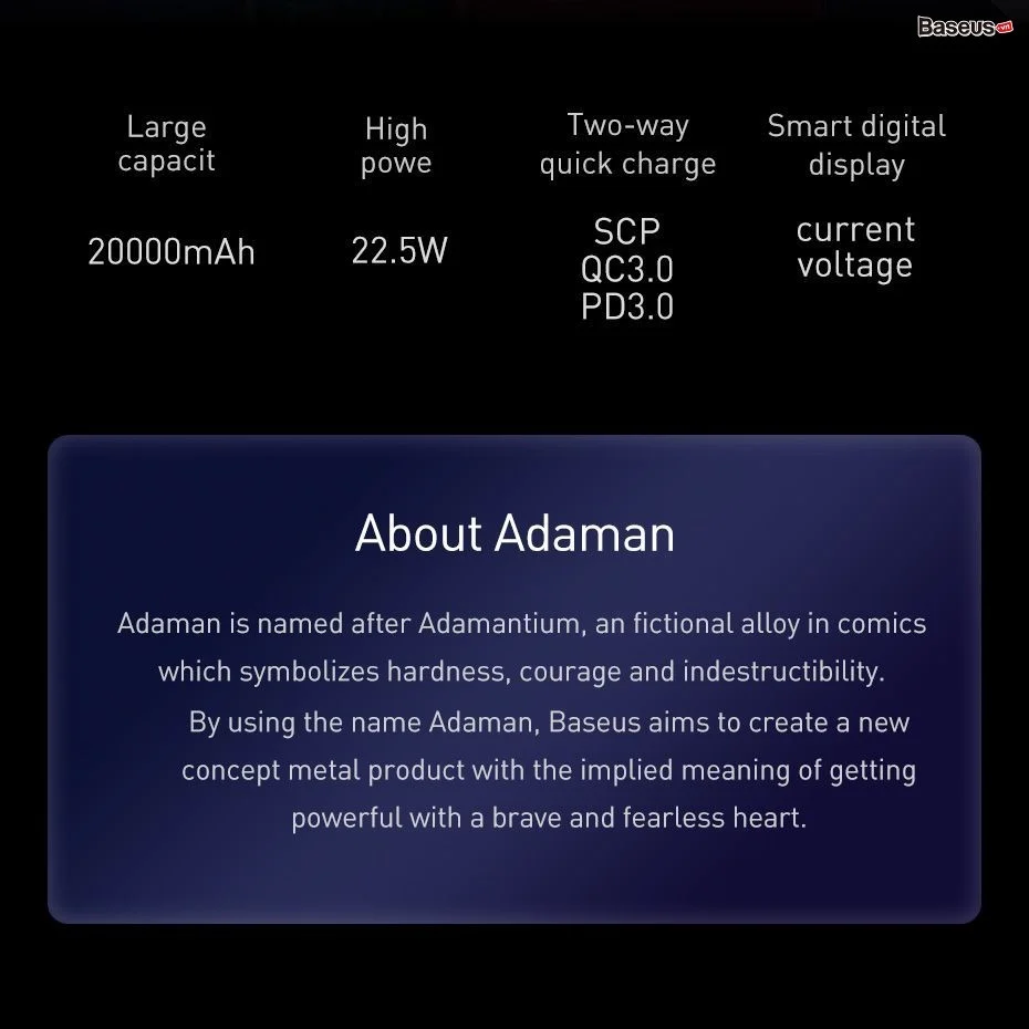 - Pin sạc dự phòng B aseus Adaman có dung lượng 20,000mAh, hỗ trợ hầu hết các chuẩn sạc nhanh hiện nay, tương thích với hầu hết các thiết bị số hiện nay từ Macbook/ Laptop cho đến Smartphone/ Tablet ... Dung lượng lớn, công suất, hiệu suất sử dụng cao (lên đến 22.5W) có 3 port (2 USB + 1 Type C). Cả 3 Port này đều hỗ trợ sạc nhanh (QC3.0 và PD3.0) , có thể dùng sạc pin cho cả 3 thiết bị cùng lúc . Giúp bạn sử dụng thoải mái hơn và quên đi nổi lo hết pin khi đi công tác, du lịch, giả ngoại ... Giúp cho mọi thiết bị của bạn luôn trong tình trạng sẳn sàng sử dụng .