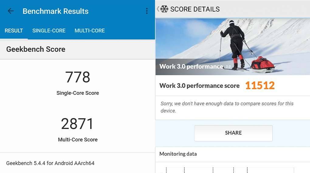 Điểm số của Snapdragon 778G 5G cũng làm cho mình khá bất ngờ khi sức mạnh của chip được khai thác gần như tuyệt đối trên con máy này với số điểm hiệu năng trên hai ứng dụng đo thông số như sau: 778 (đơn nhân), 2871 (đa nhân) cho BenchMark và 11512 điểm trên PCMark.