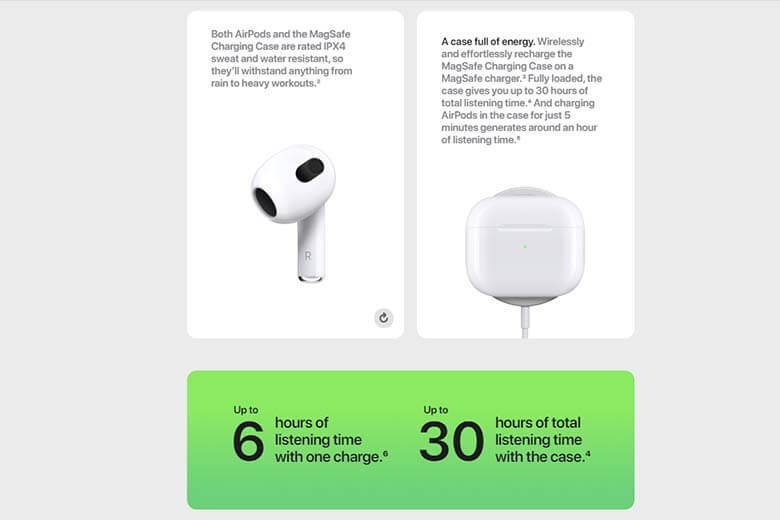 Chiếc Airpods 3 có dung lượng pin khá ấn tượng, với một lần sạc có thể cho ra thời lượng sử dụng lên đến 5 giờ liên tục. Cụ thể bạn có thể nhạc 5 giờ liền hoặc 3.5 đến 4 giờ đàm thoại, hộp đựng Airpods 3 còn cho thời gian lưu trữ pin từ 18 - 24 giờ.