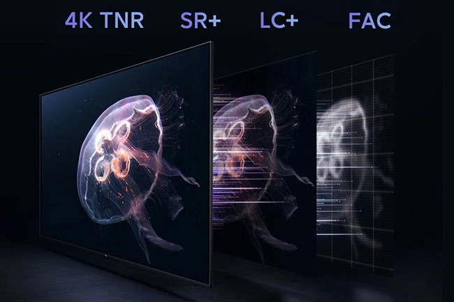 4K TNR giúp khử nhiễu hình ảnh, SR+ giúp hình ảnh được tái tạo sắc nét hơn, LC+ tăng cường độ tương phản cục bộ và FAC mang đến khả năng phục hồi thích ứng chế độ phim điện ảnh.