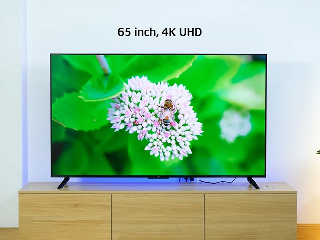 Màn hình 65 inch độ phân giải 4K siêu nét. Khả năng hiển thị của TV được quyết định bởi tấm nền LCD hỗ trợ 1.07 tỷ màu, kèm công nghệ HDR10+ và Dolby Vision cho phép hình ảnh được tái tạo vô cùng sống động, màu sắc tươi sáng, độ tương phản cao. Tấm nền có góc nhìn rất rộng với 178 độ giúp người xem TV từ nhiều góc độ mà màu sắc không thay đổi.