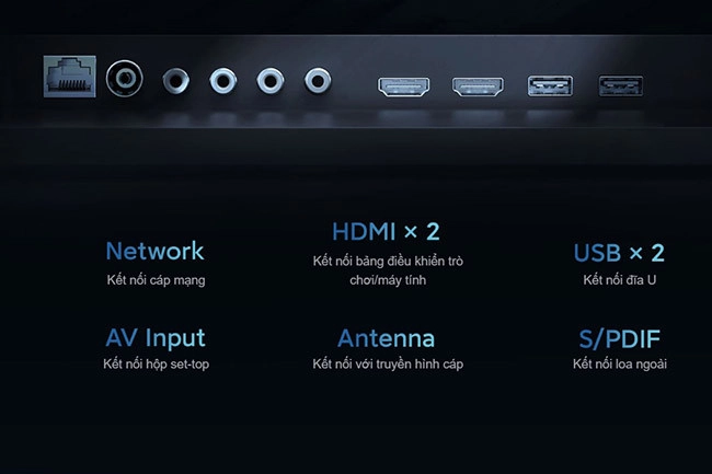 Chưa dừng lại ở đó, máy còn còn có 2 cổng USB-A giúp bạn kết nối với chuột, bàn phím, USB dữ liệu để nghe nhạc, xuất hình ảnh. Cổng antena, cổng mạng internet và cổng âm thanh S/PDIF cũng được tích hợp trên mặt sau của TV.